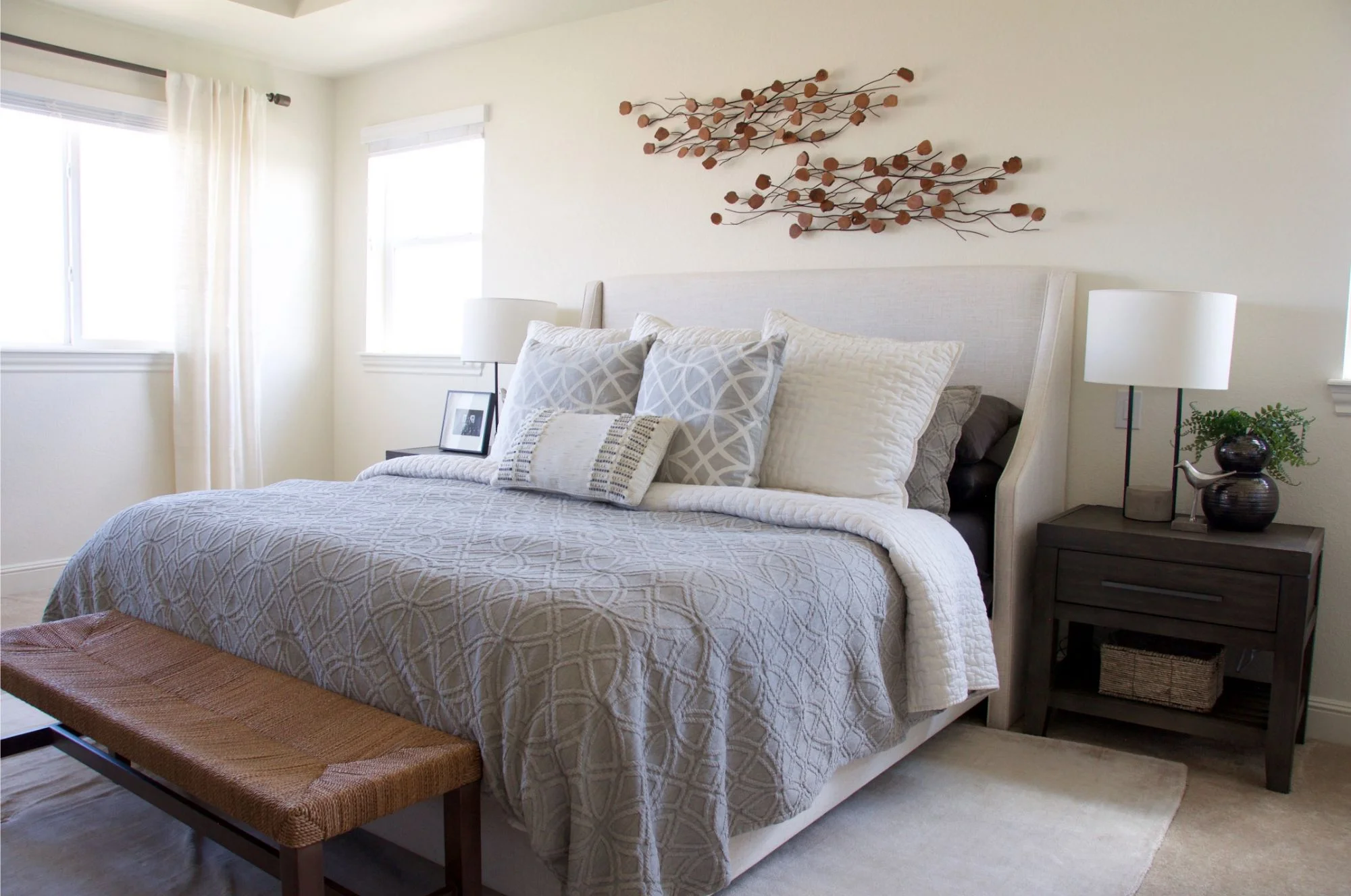 I’m always a sucker for adding wood tones to a room, and this space was no exception. I love this desk with the gallery wall above - and those wood tones helped to warm up all of the grays and other neutrals. The white space of these frames make such a stylish statement, too. The tree rings above the bed and the bench at the end of the bed helped to tie in the lighter, more natural colors of the wood.