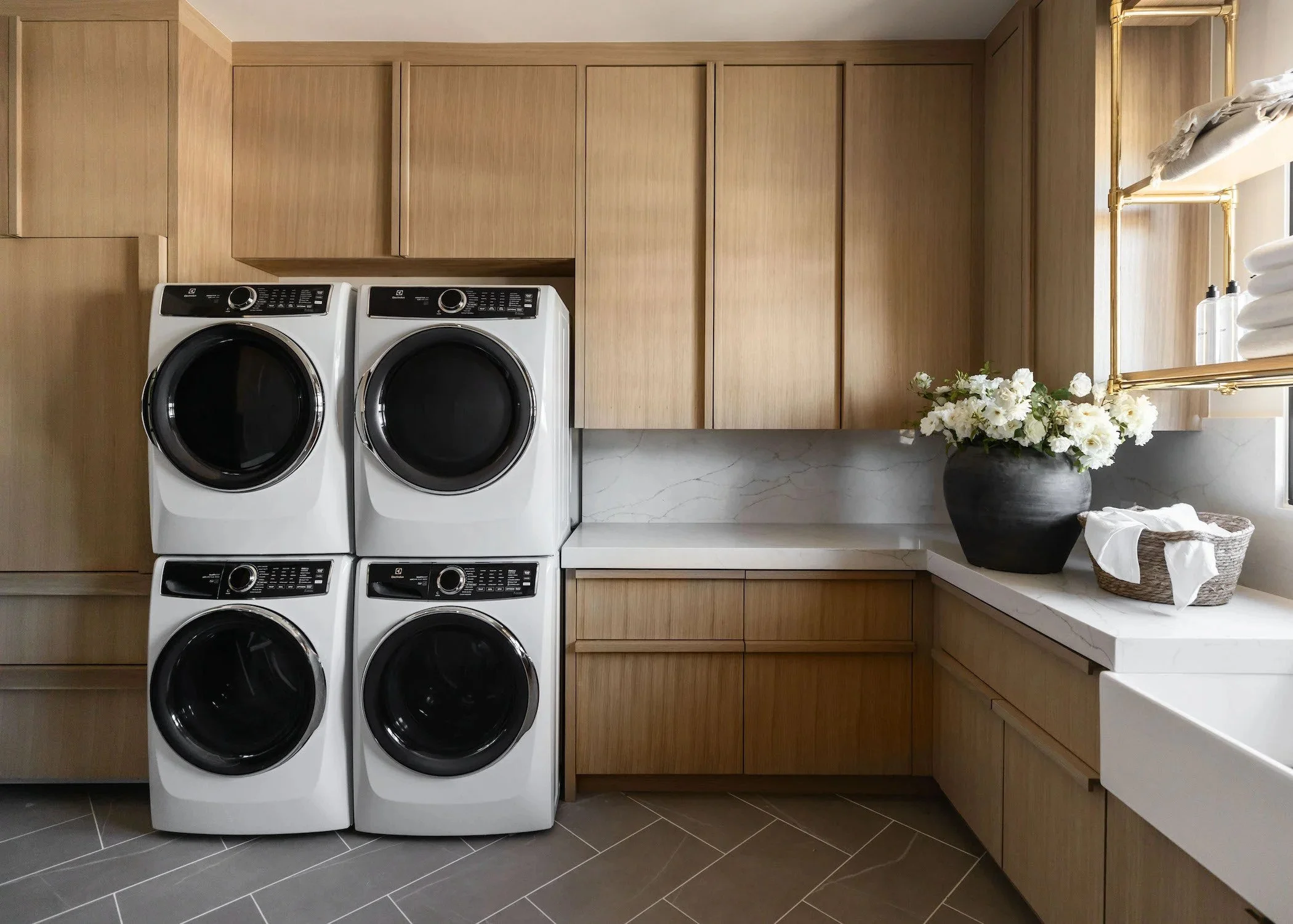 The laundry room of our dreams always includes a double washer-dryer set up (because #efficiency), and we love the look and functionality of these extra wide countertops — perfect for sorting and folding on laundry day(s).