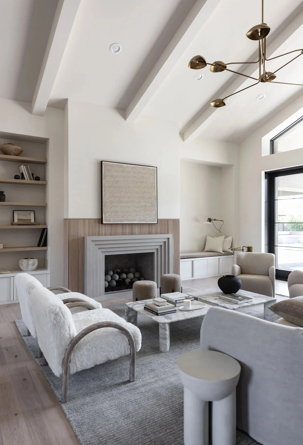 We love how the design team brought in this wood fluted paneling to contrast with the cast stone fireplace surround. The placement and layering of the Studio McGee abstract canvas artwork above is a beautiful alternative to a more traditional mantel piece. (Fun fact: We used this same artwork in the Valgoi Project 2.0!)